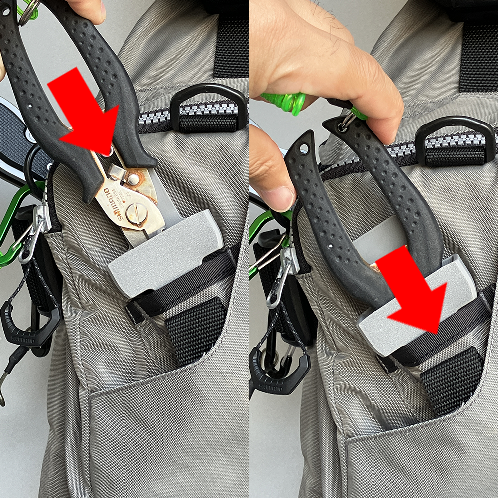 フローティングベストやバッグに搭載されているプライヤーホルダーって、サッと差し入れることができなかったりませんか?